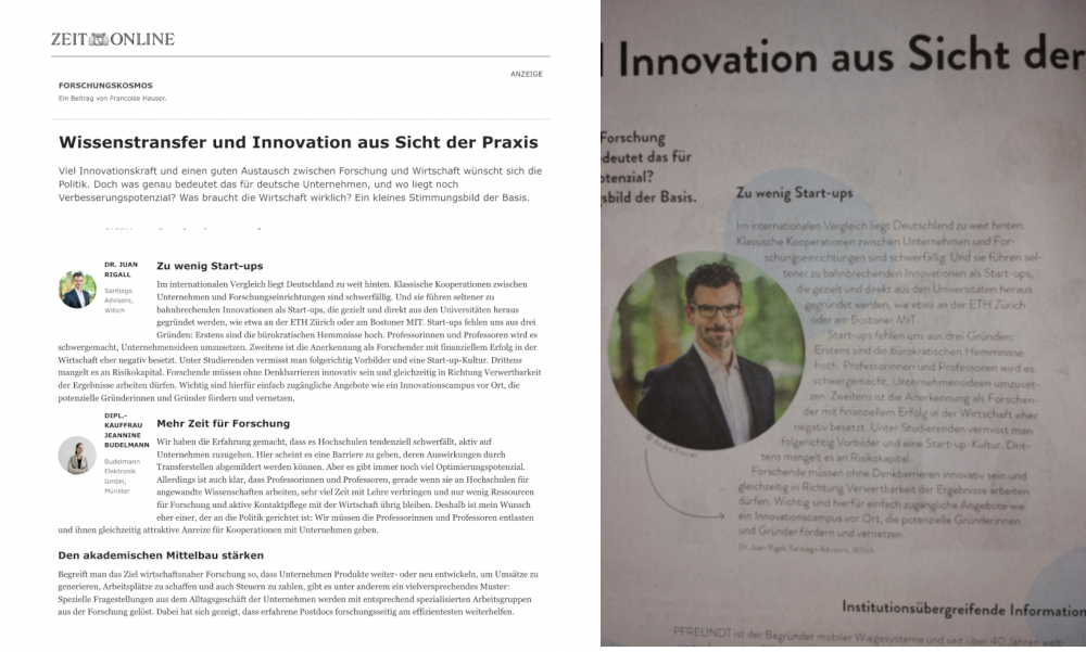Seit 2009 unterstützt das Santiago-Team Unternehmenslenker bei der Gestaltung und Umsetzung von leistungsfähigen Wachstums-Strategien und den dazu notwendigen Organisationskonzepten. Mit dem Motto „Enabling Growth“ begleitet Santiago Konzerne und mittelständische Unternehmen z.B. bei der Neuaufstellung ihrer Forschungs- und Entwicklungsabteilungen, dem Aufbau von neuen Geschäftsfeldern und Inkubatoren, der Beschleunigung von Innovationsprozessen, der Umsetzung von Digitalisierungsstrategien oder bei der Umsetzung von Initiativen zur Weiterentwicklung der Innovationskultur.